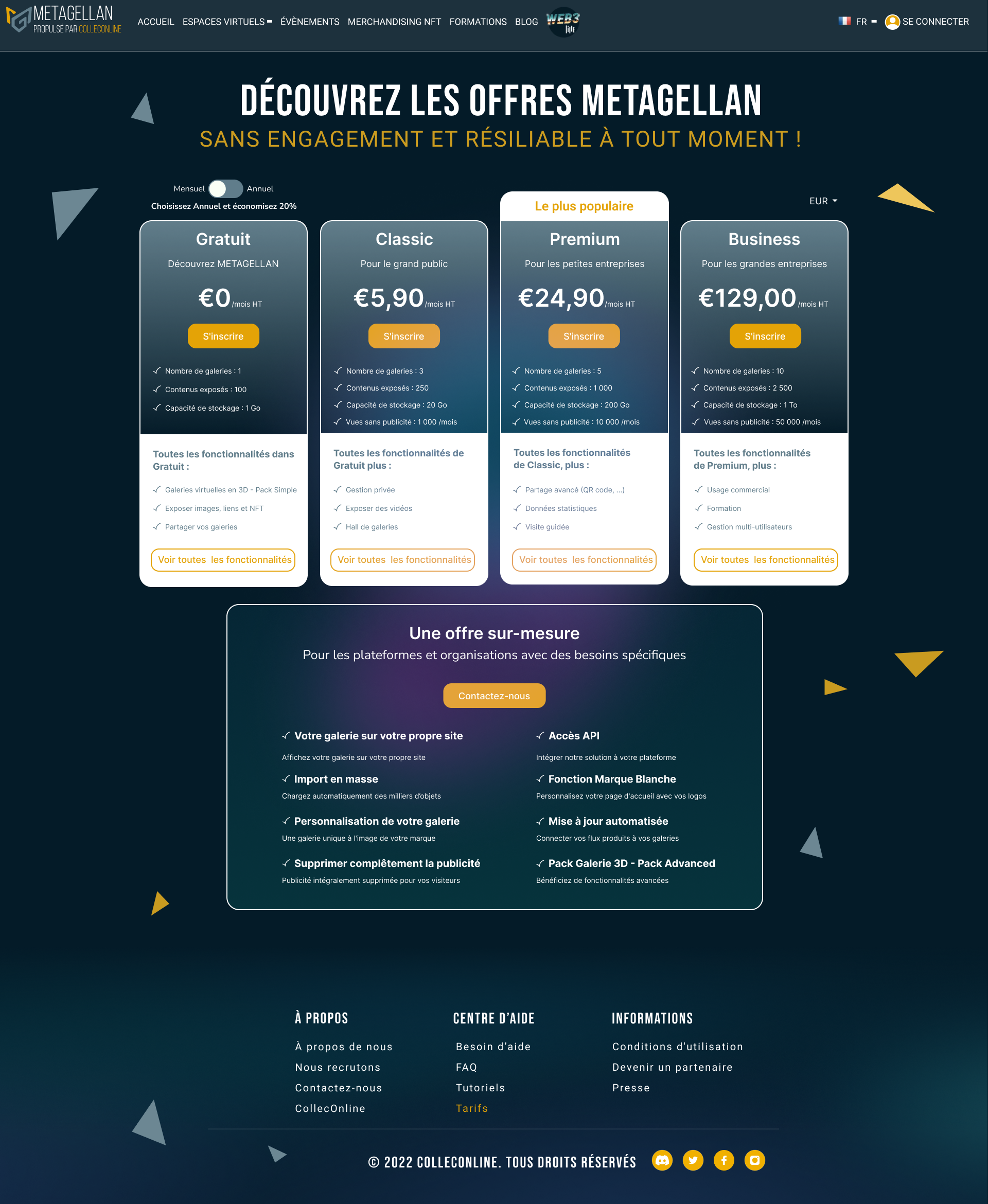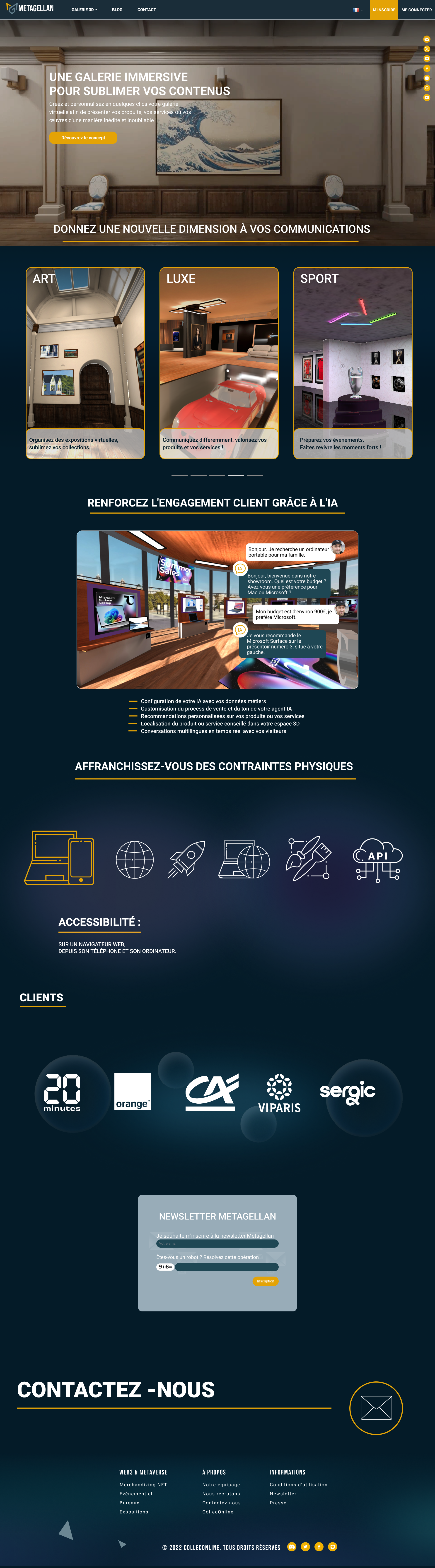 Metagellan was a digital platform designed to access and navigate immersive virtual spaces. I led the complete UX/UI design of the website; what is shown here is a curated selection of key screens. The overview includes the homepage, user profile, pricing and features pages, a blog mockup, and a concept page.