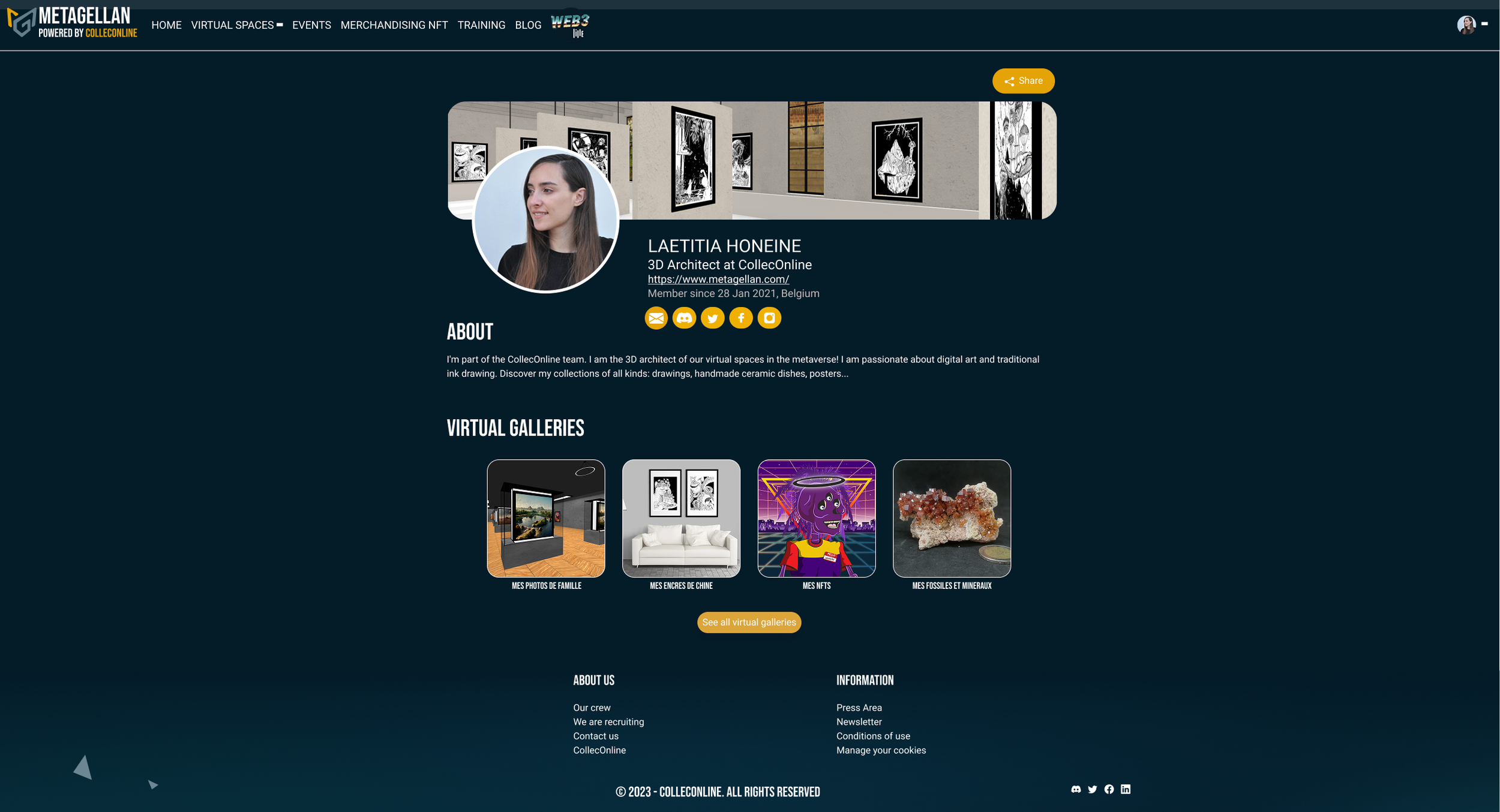Designed for desktop and mobile use, the Metagellan platform allows users to explore 3D exhibitions and immersive spaces directly from their phone, without an app, using only a web browser. The interface supports two navigation modes, Gamer and Classic, adapting to user preferences and enabling intuitive one- or two-thumb control for smooth navigation and interaction.